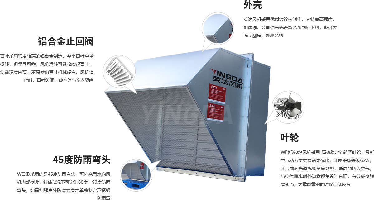 WEXD采用的是45度防雨彎頭,可杜絕雨水向風機內部倒灌,特殊公況下可定制60度,90度防雨彎頭,如需加強室外防腐力度才單獨制定不銹鋼防雨罩。