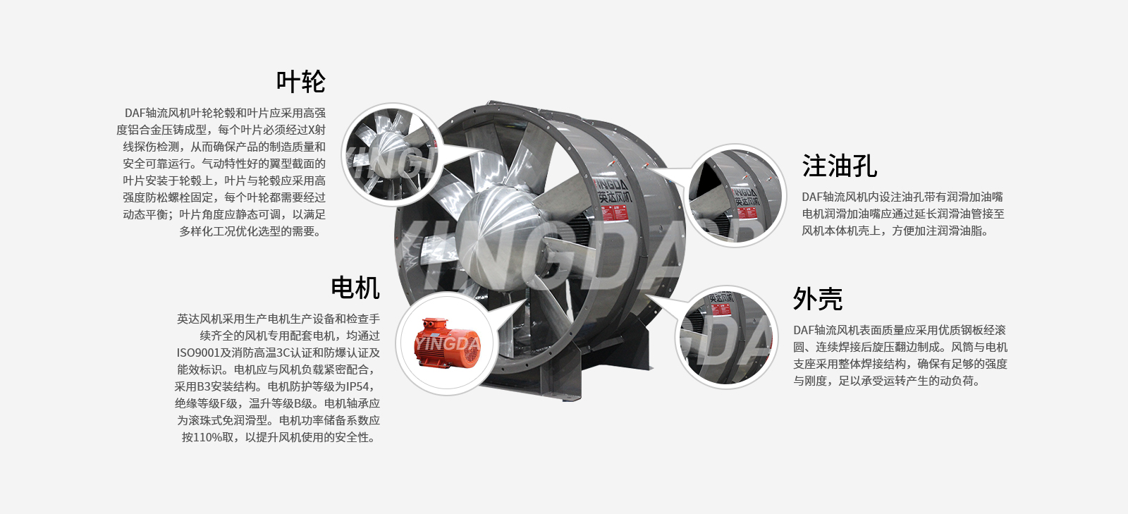 DAF軸流風機內設注油孔帶有潤滑加油嘴電機潤滑加油嘴應通過延長潤滑油管接至風機本體機殼上,方便加注潤滑油脂。