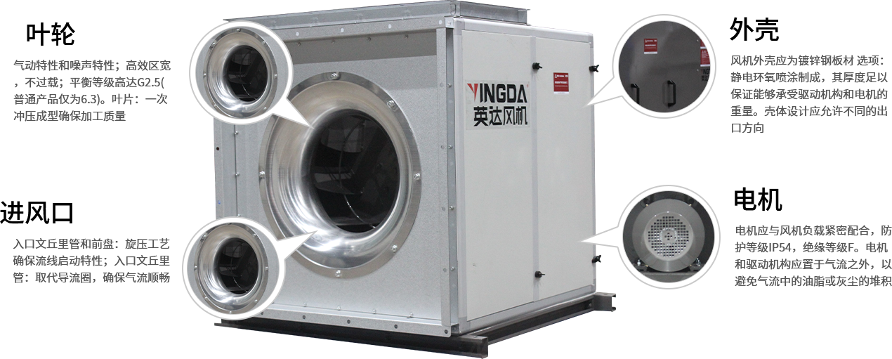 電機應與風機負載緊密配合,防護等級IP54,絕緣等級F。電機和驅動機構應置于氣流之外,以避免氣流中的油脂或灰塵的堆積。